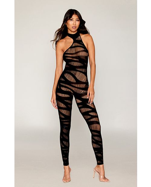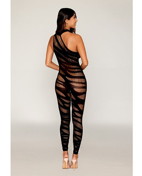 Features an all-over slash design detail, adding an asymmetrical appeal to the bodystocking. Designed with a halter neckline and knitted neckband for added style and support. G-string not included.