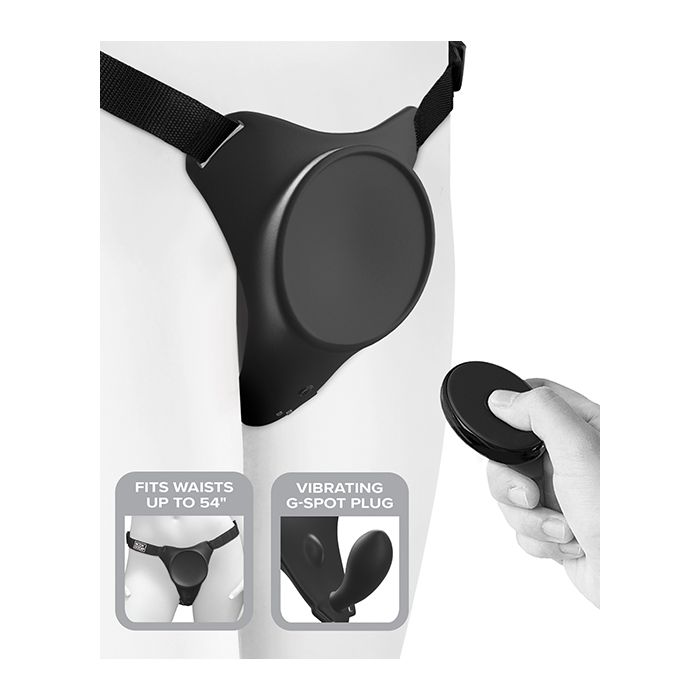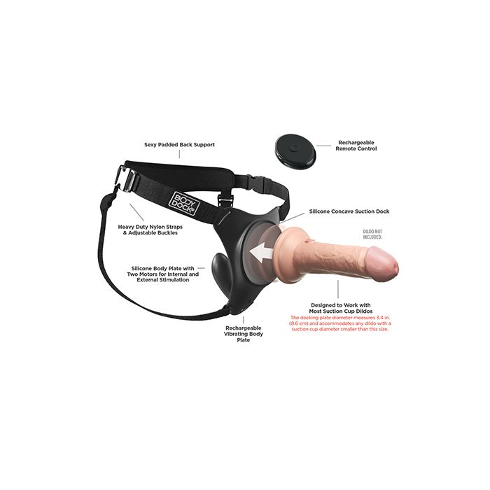 TAccommodates any dildo with a suction cup diameter of 3.4 in. (8.6 cm) or smaller. Features vibrating silicone body plate with G-Spot plug, padded back support, adjustable buckles, rechargeable remote, & USB charging cord. Form-fitted body plate distributes pressure, evenly enhancing comfort, while the angled suction dock keeps the dildo erect. 2 powerful motors with 10 vibration modes. Fits waists 24-56 inches.