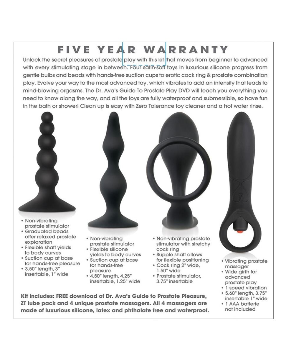 Unlock the secret pleasure of prostate play with this kit that moves from beginner to advanced with every stimulating stage in between. Four satin soft toys in luxurious silicone progress from gentle bulbs and beads with hands free suction cups to erotic cock ring and prostate combination play. Evolve your way to the most advanced toy, which vibrates to add an intensity that leads to mind blowing orgasms. The Dr. Ava's Guide to Prostate Play DVD will teach you everything you need to know along the way, and all the toys are fully waterproof and submersible. Includes free download of Dr. Ava's Guide to Prostate Pleasure, Zero Tolerance lube pack and 4 unique prostate massagers.