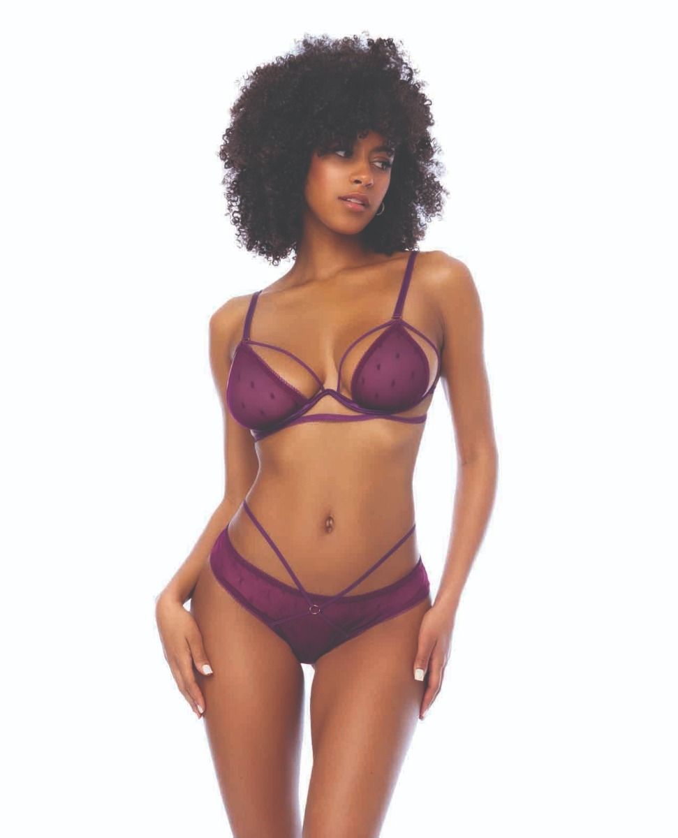 Our polka-dot mesh reinvented in a new color that exudes passion. Two-piece set, includes a top with underwire and adjustable straps and matching open back panty. Hand wash & drip dry.