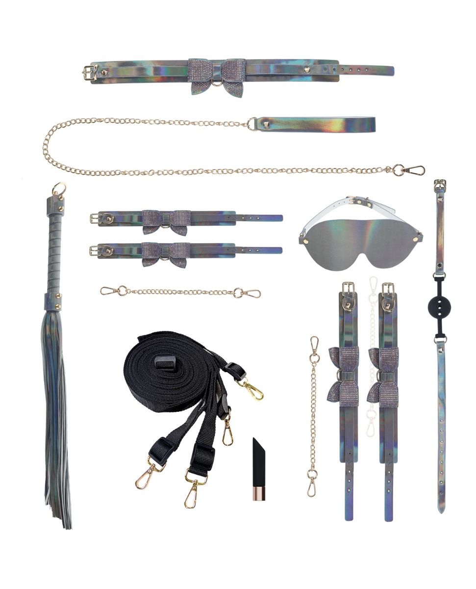 The Paris Collection Kit by Ouch! comes in a gorgeous handbag, with a high end iridescent look on its hardware, and it includes a collar and leash, a set of handcuffs, and set of ankle cuffs, a blindfold, a breathable ball gag, a flogger, an under the mattress restraint, and a rechargeable vibrating bullet. The perfect kit to satisfy even the most advanced bondage lovers. All Shots toys come with a 1-year warranty.Bag size: 11.81" x 4.13" x 7.28"